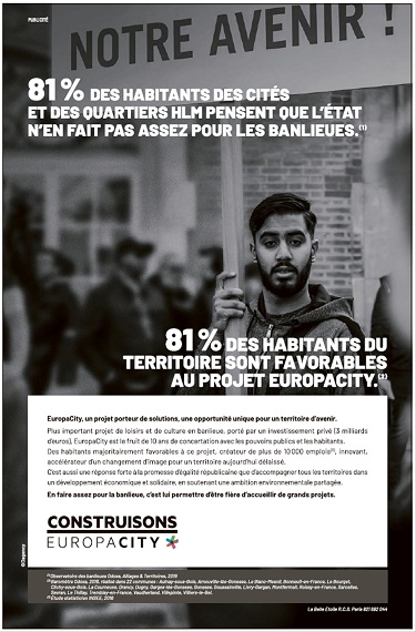 Voir l’Adresse au Président de la République publiée mardi 23 juillet 2019 dans la rubrique Planète du site internet de l’hebdomadaire L’Obs par Éric AESCHIMANN « Monsieur le président, arrêtez la folie Europacity ! » lCI.
