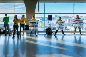 Samedi, ce sont des génies du triangle qui sont solidairement venus à Roissy, pendant l’action “Non au T4” (nos facebook et tweeter étaient en direct). Bien visibles, ils ne sont pas allés sur les pistes, mais ont demandé la libération de toutes et tous les retenu·e·s ! (mise à jour : ce qui est fait !). Pendant ce temps, nos correspondant·e·s de Montpellier ont été marcher vers son aéroport !